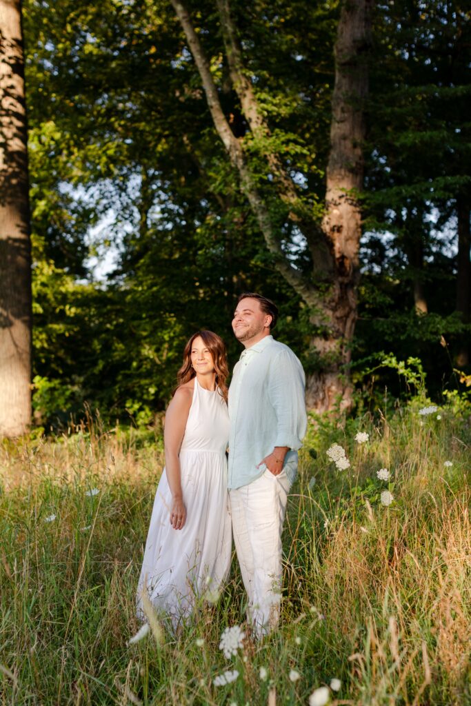 Brittany’s white dress from Tuckernuck was the perfect balance of classic and playful. It photographed beautifully and moved well as we walked through the open fields. For engagement photos, choosing an outfit that feels elevated but comfortable is key. When you’re comfortable and confident in your clothes, it’s easier to relax and be yourself on camera.